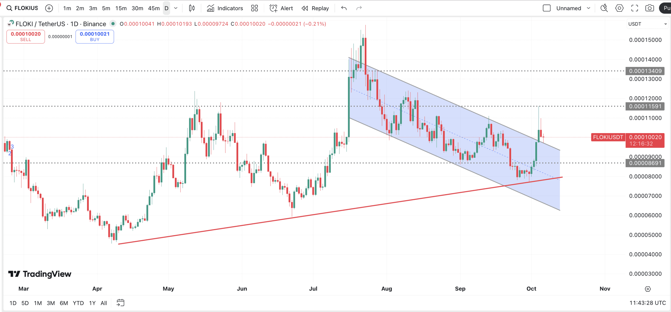 قیمت پس از شکست خط روند نزولی اصلی (خط مورب سیاه)، برای مدتی در محدودهای خنثی نوسان داشت. اما در هفتههای اخیر با کاهش حجم معاملات و ضعف تقاضا دوباره به حمایت ۰.۰۰۰۰۳۰ دلار بازگشته است. در صورت از دست رفتن این سطح، احتمال سقوط قیمت تا حمایت بعدی در ۰.۰۰۰۰۲۵ دلار وجود دارد.