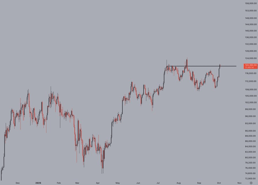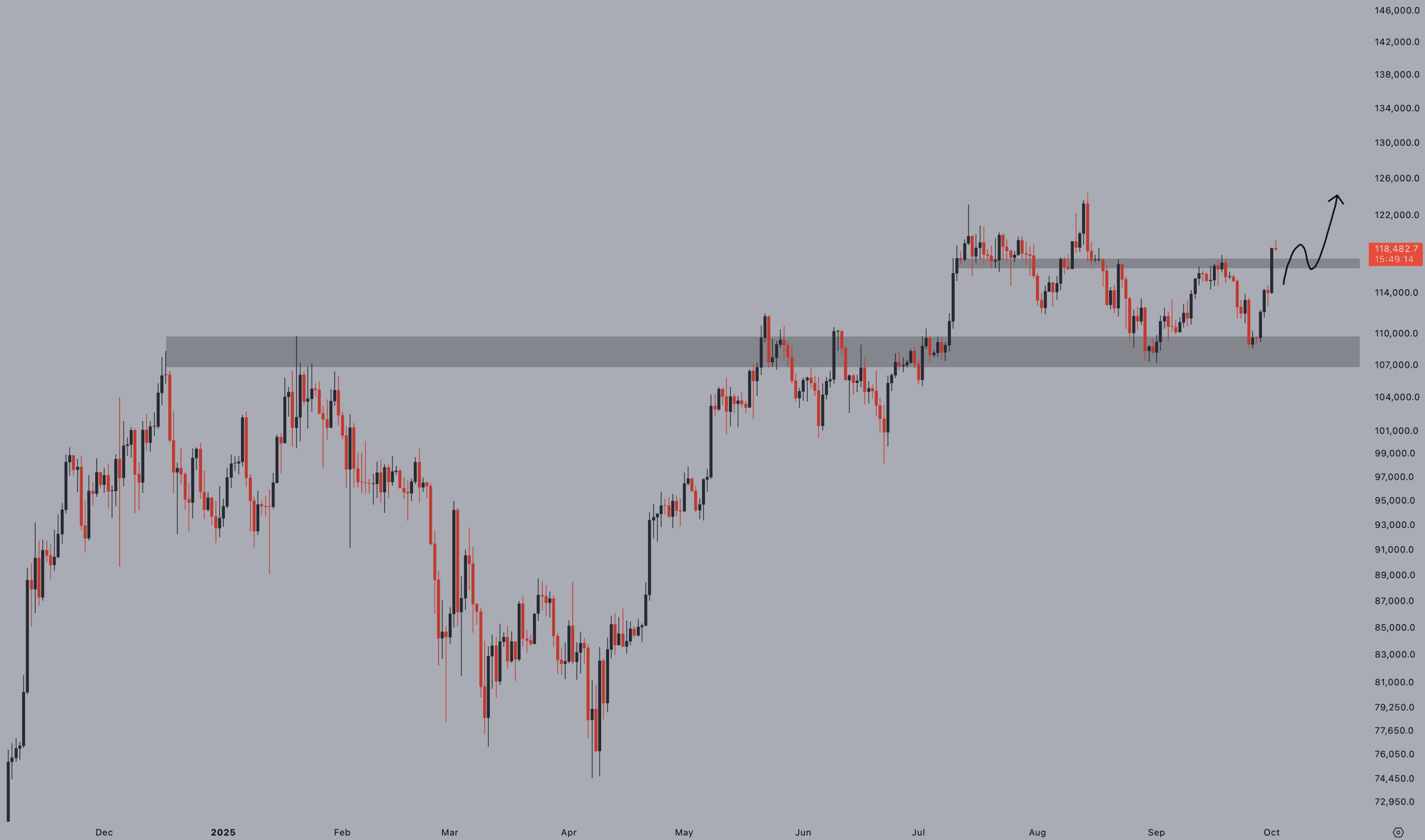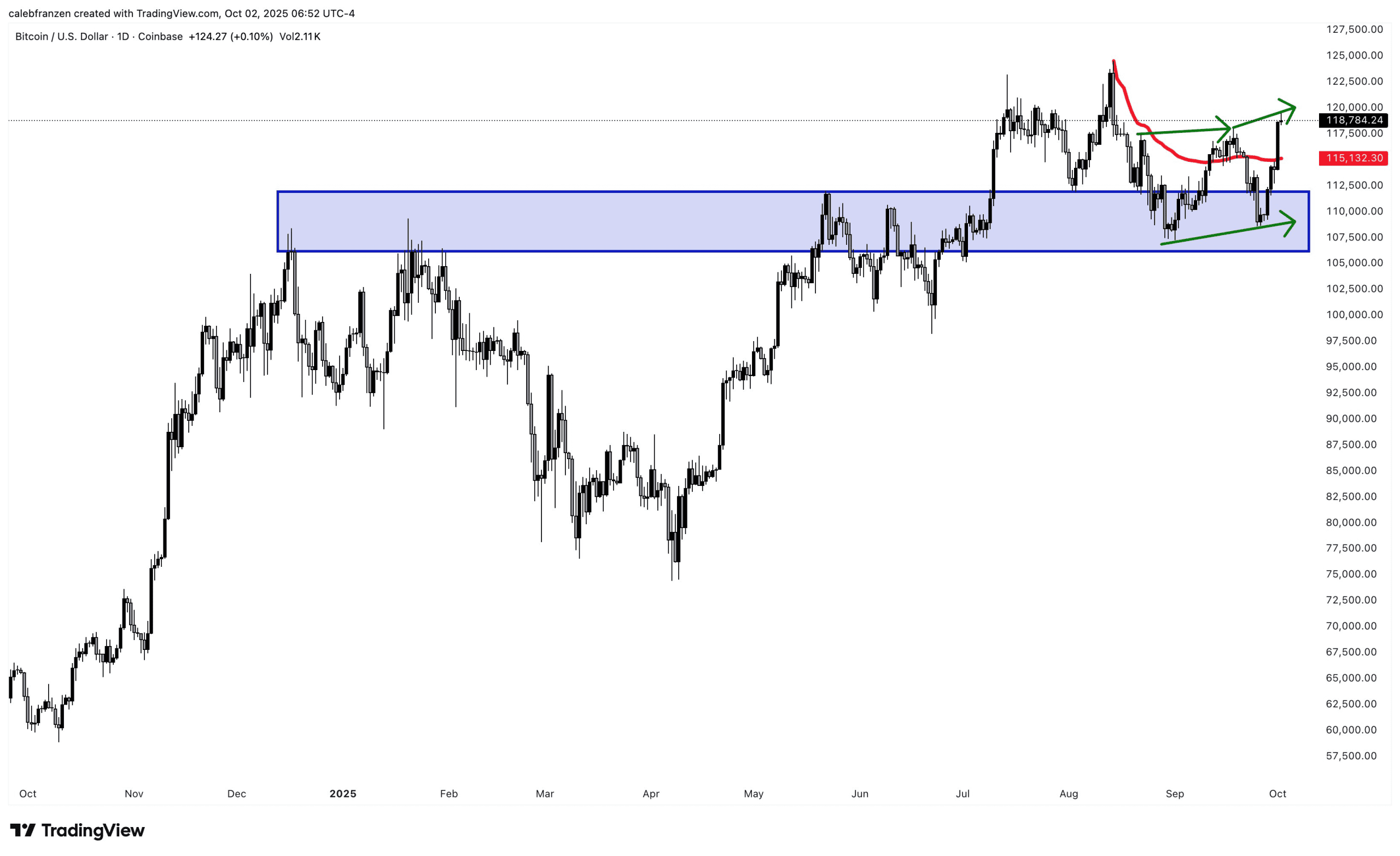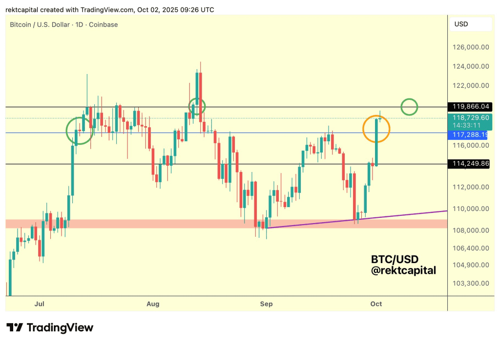 بیت کوین در آستانه ثبت یک کلوز روزانه درون رنجش است تا روند بازپسگیری را آغاز کند. بیت کوین تنها به یک کلوز روزانه بالای حدود ۱۱۷,۲۰۰ دلار نیاز دارد تا برای آزمودن دوباره محدوده ۱۲۰٬۰۰۰ دلار به بالا آماده شود.