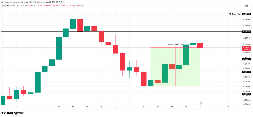 قیمت PUMP در ۰.۰۰۷۵ دلار قرار دارد و کمی بالاتر از حمایت ۰.۰۰۷۴ دلار است. در صورت جهش از این سطح، احتمال رشد تا سقف تاریخی ۰.۰۰۹۰ دلار (معادل ۲۱ درصد افزایش) وجود دارد. با توجه به رشد ۲۷ درصدی این توکن طی هفته گذشته، احتمال ادامه روند صعودی بالاست.