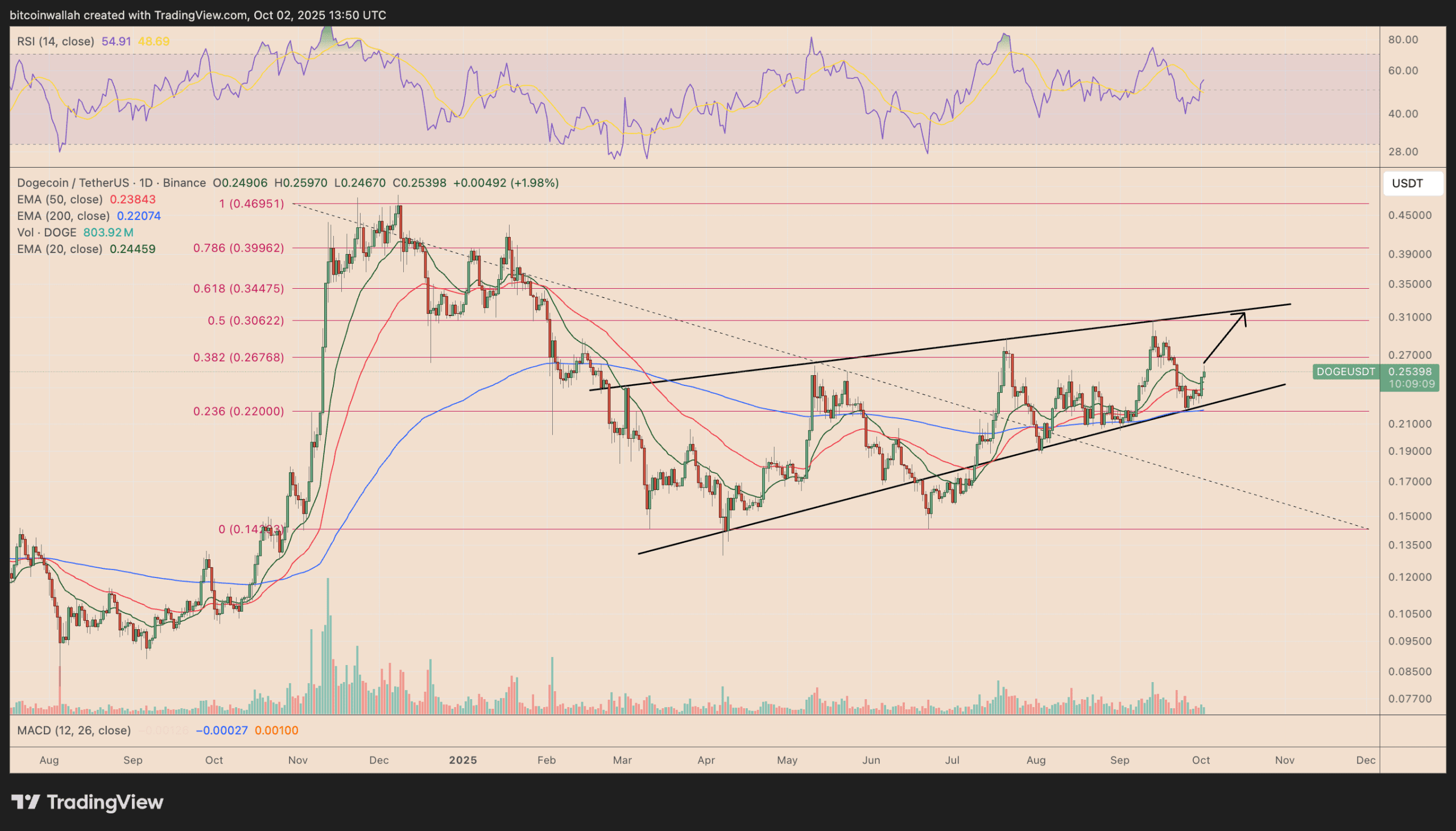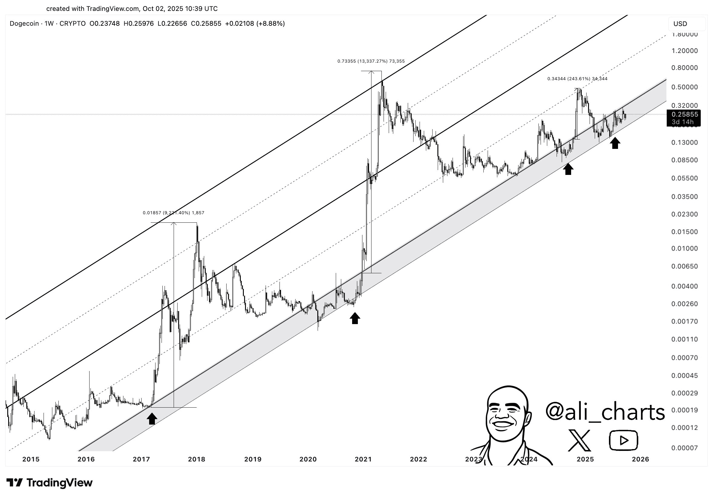 او با انتشار نموداری نشان داد که دوج کوین در یک الگوی مگافون صعودی معامله میشود؛ الگویی که معمولاً باعث رشدهای پیدرپی و بزرگ شده است. بر اساس این الگو، موج بعدی میتواند قیمت DOGE را تا ۱.۴۰ دلار افزایش دهد (یعنی حدود ۴۰۰ درصد رشد از سطح فعلی).