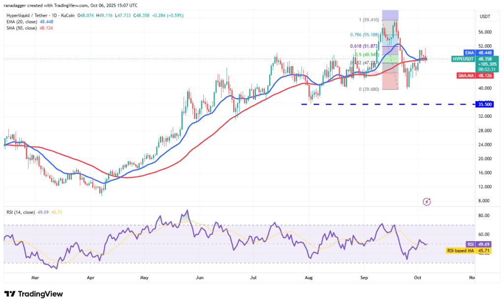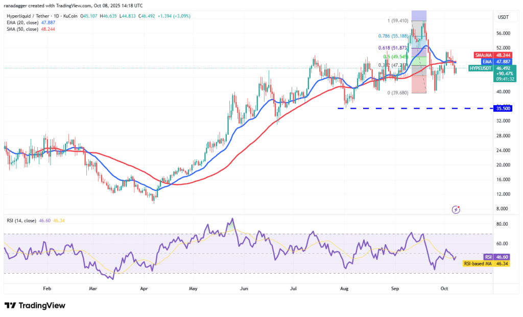 شاخص RSI نشانههای اولیه از واگرایی نزولی را نشان میدهد که حاکی از تضعیف شتاب صعودی است. اگر فروشندگان قیمت هایپرلیکویید را به زیر میانگین متحرک نمایی ۲۰ روزه (موج آبی، ۵۲.۳۰ دلار) بکشانند، درها برای سقوط به ۴۹.۸۸ دلار و سپس میانگین متحرک ساده ۵۰ روزه (موج قرمز، ۴۶.۴۱ دلار) باز خواهد شد.
