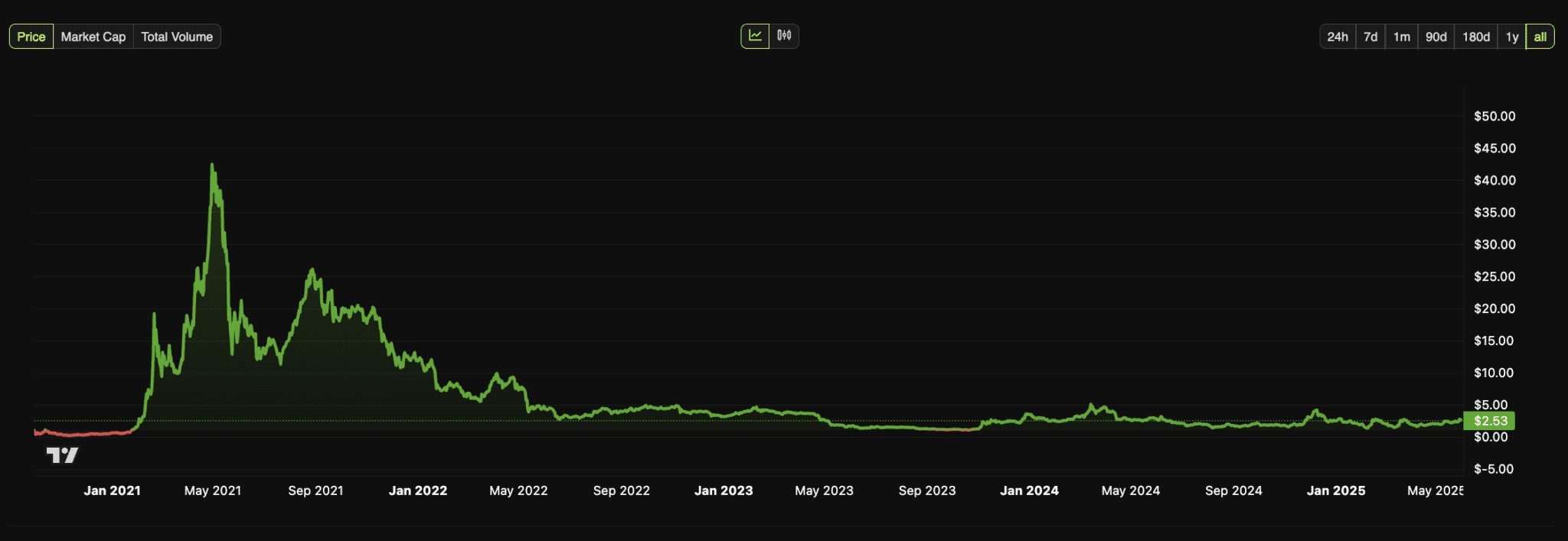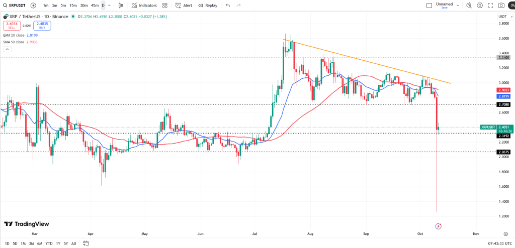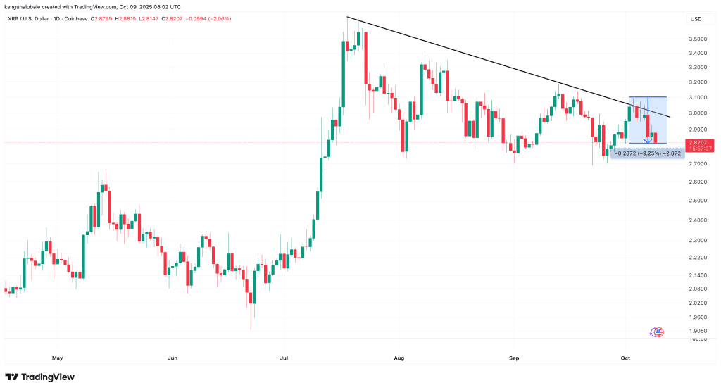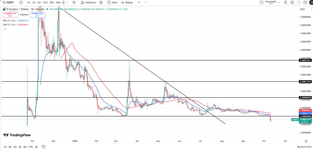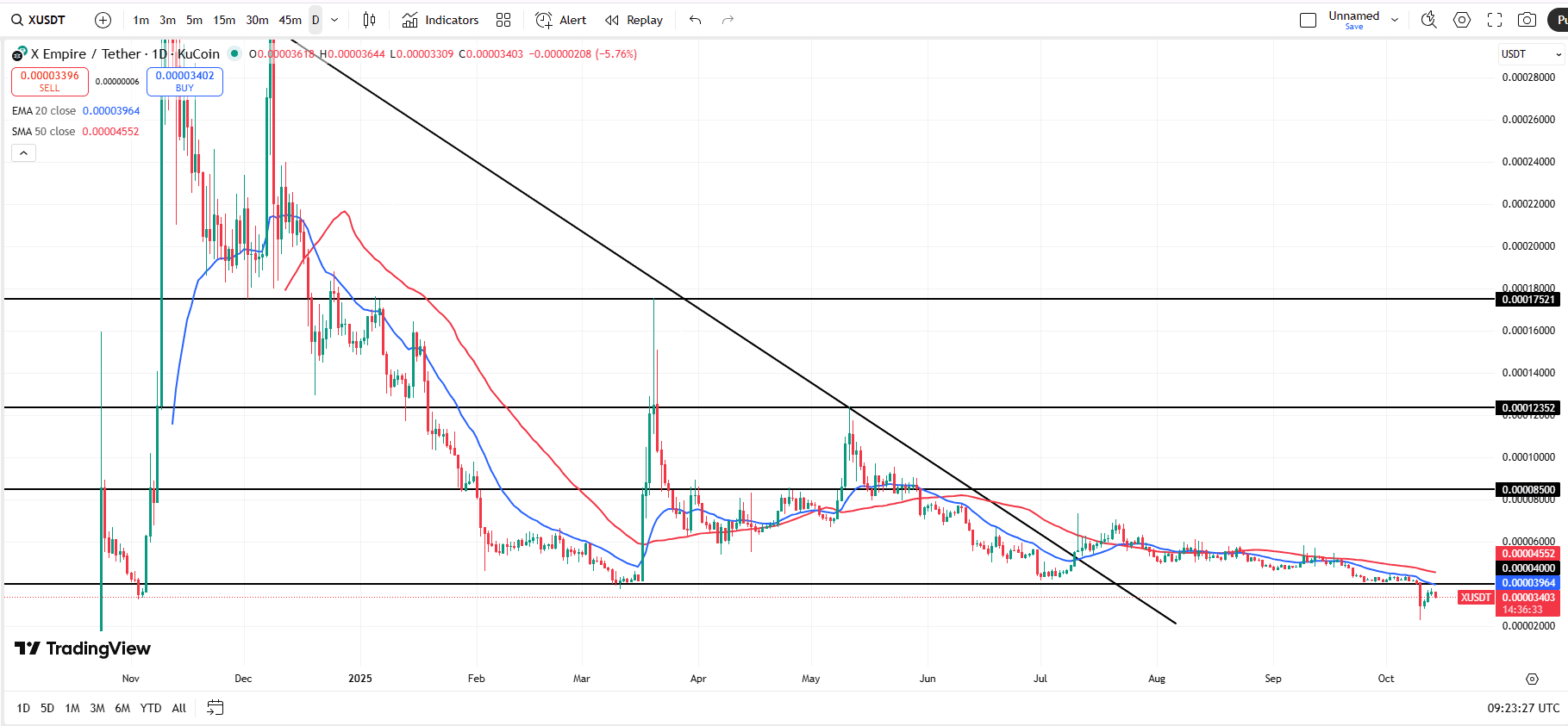 نمودار روزانه ایکس امپایر نشاندهنده یک روند نزولی طولانیمدت است که از ماههای پایانی ۲۰۲۴ تاکنون ادامه داشته است.