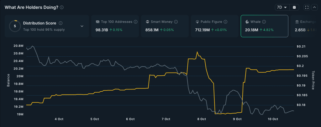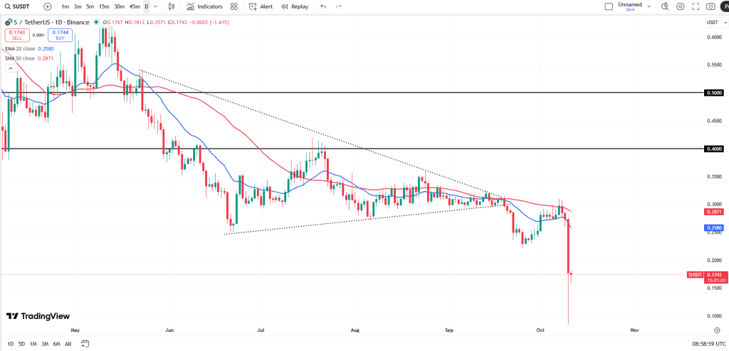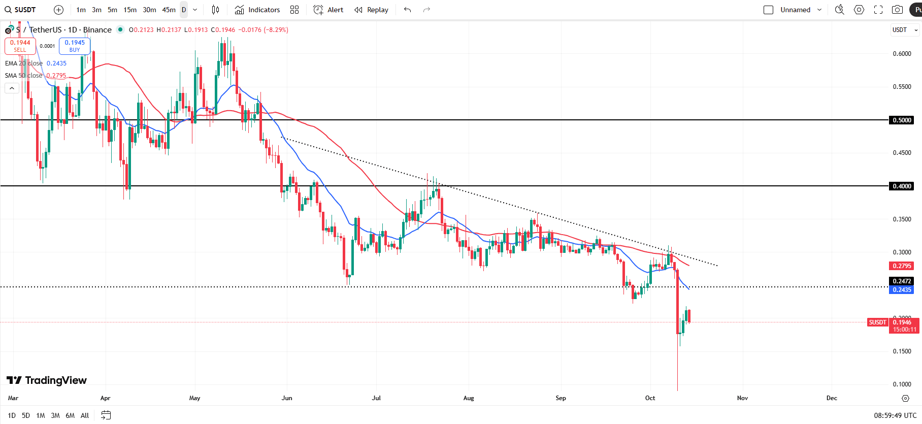 قیمت فعلی در حدود ۰.۱۹ دلار است و زیر میانگینهای متحرک نمایی ۲۰ روزه (۰.۲۴ دلار) و ساده ۵۰ روزه (۰.۲۷ دلار) معامله میشود که هر دو نقش مقاومتهای مهم را ایفا میکنند.