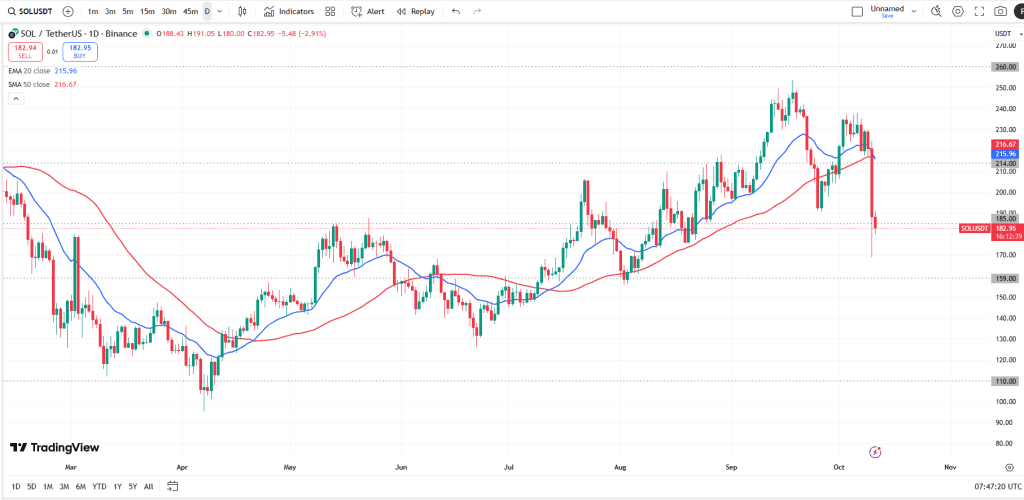در سناریوی نزولی، شکست و بستهشدن کندل قیمت زیر میانگین متحرک نمایی ۲۰ روزه نشان میدهد که خریداران در حال سیو سود هستند. این حرکت میتواند قیمت سولانا را به خط روند صعودی بکشاند؛ جایی که احتمالاً دوباره تقاضا افزایش مییابد.