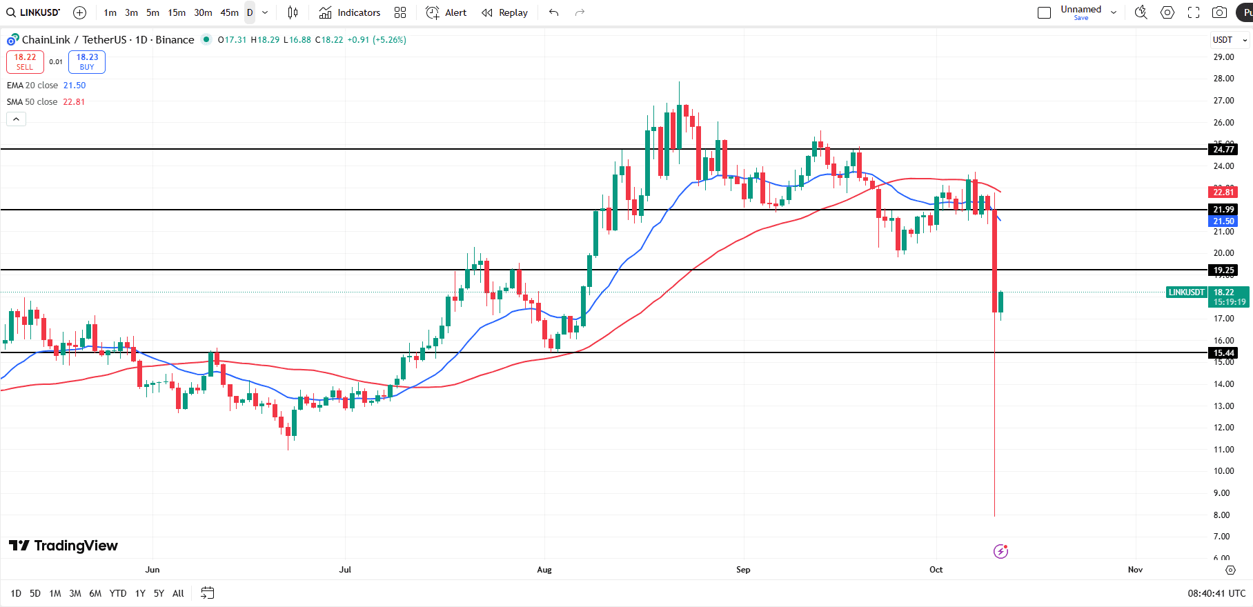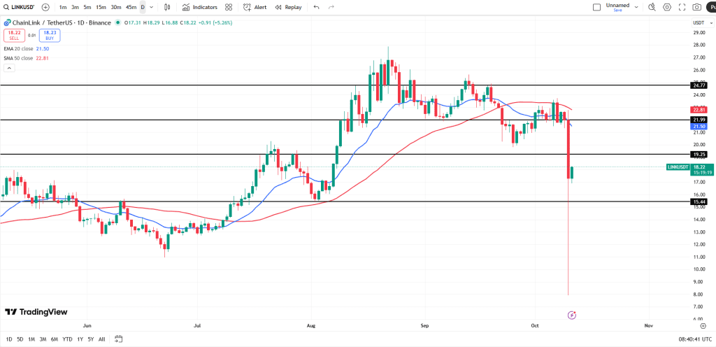 در سمت نزولی، شکست و بستهشدن کندل قیمت زیر میانگین متحرک ساده ۵۰ روزه نشان میدهد فروشندگان دوباره کنترل بازار را به دست گرفتهاند. در این شرایط، ارز دیجیتال LINK میتواند تا خط روند صعودی سقوط کند؛ جایی که انتظار میرود تقاضا افزایش یابد.