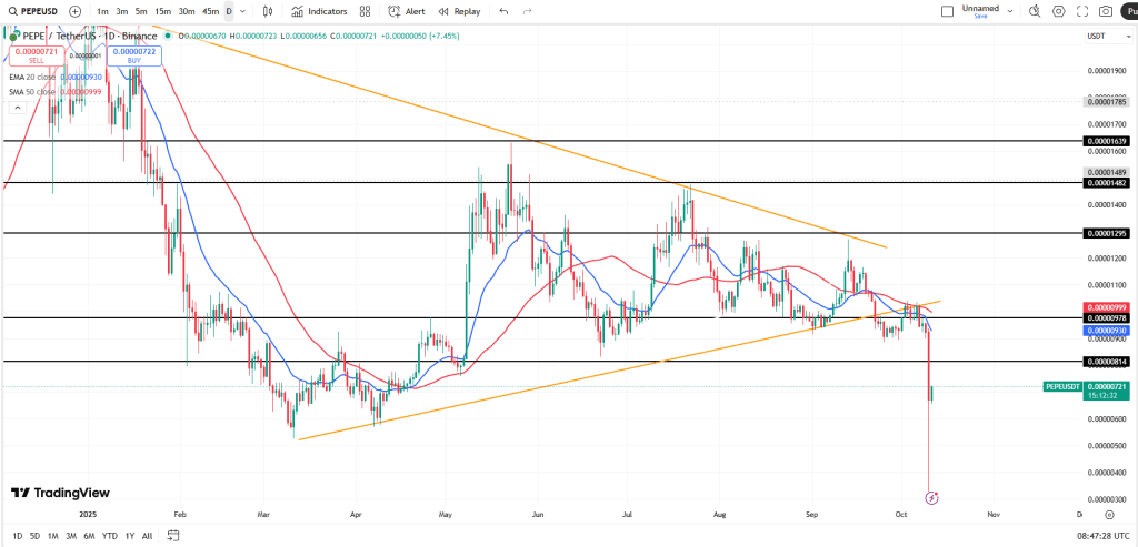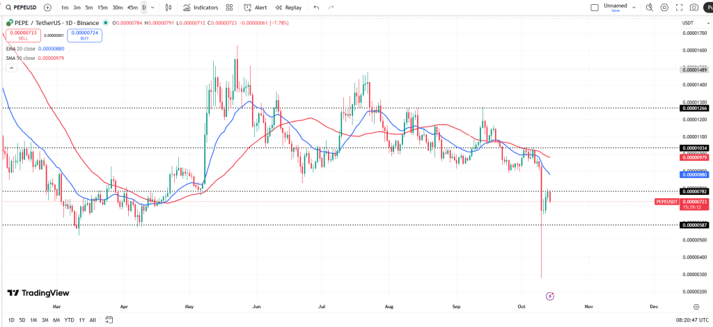 طبق دادههای تریدینگویو، نمودار روزانه جفتارز PEPE نشان میدهد که این توکن پس از سقوط سنگین اخیر، هنوز در فاز بازیابی اولیه قرار دارد و نشانهای قطعی از بازگشت روند صعودی دیده نمیشود.