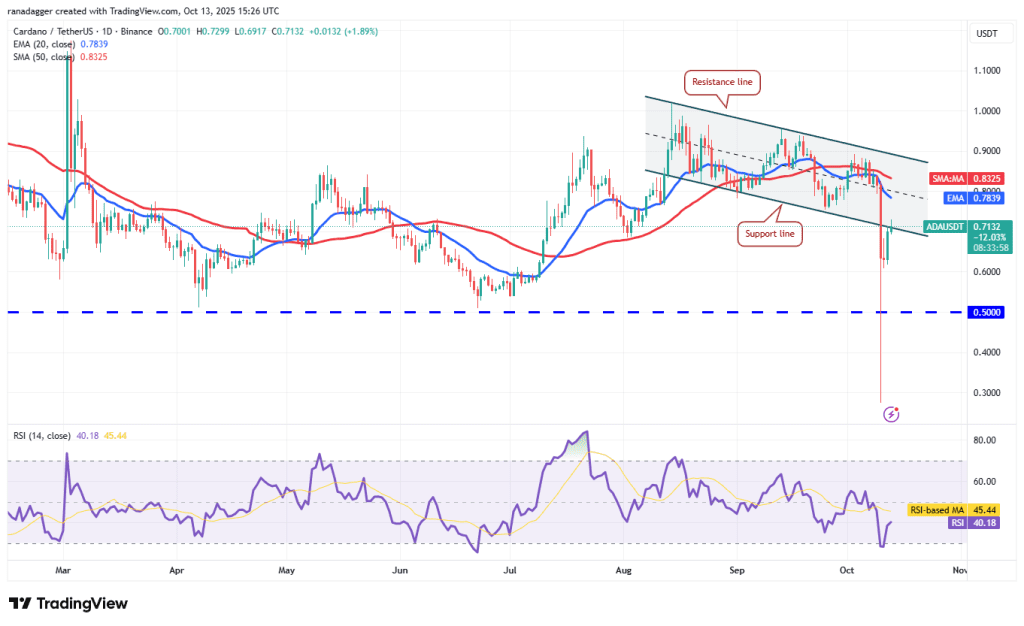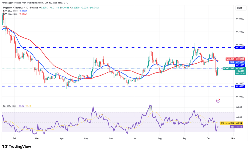 قیمت دوج کوین به سرعت بازگشت و دوباره به محدودهی گستردهی ۰.۱۴ تا ۰.۲۹ دلار وارد شد. خریداران اکنون تلاش میکنند قیمت را به میانگین متحرک نمایی ۲۰ روزه (موج آبی، ۰.۲۳ دلار) برسانند که ممکن است با مقاومت فروشندگان مواجه شود. اگر قیمت از این سطح کاهش یابد، ارزDOGE میتواند ابتدا تا ۰.۱۸ دلار و سپس تا ۰.۱۶ دلار افت کند.