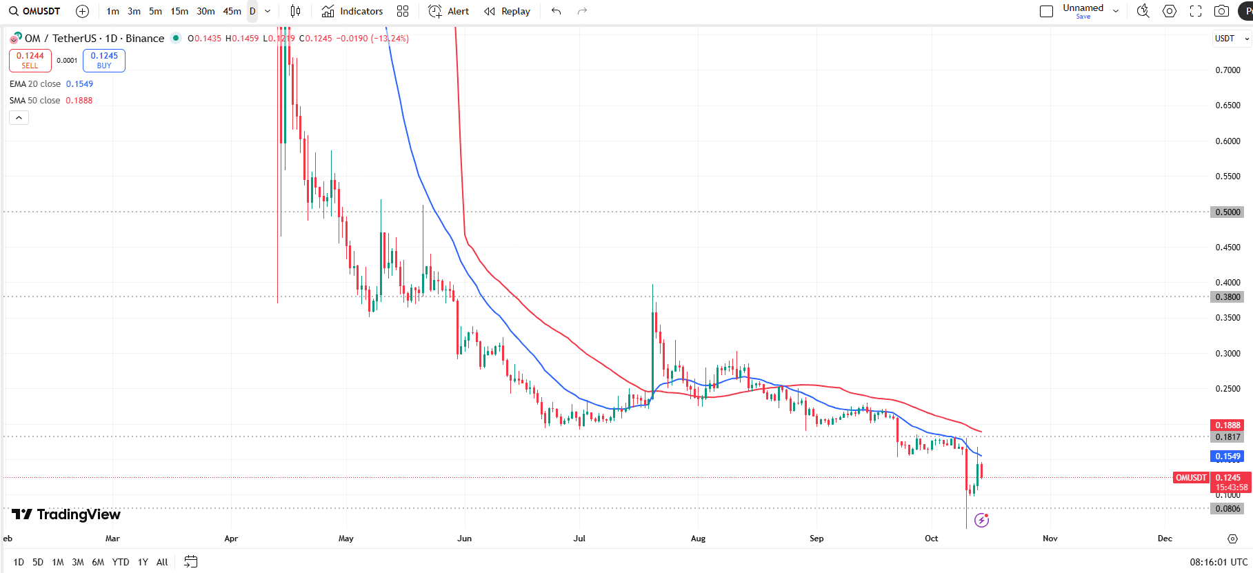 در هفته اخیر، قیمت OM تا محدوده ۰.۰۸ دلار سقوط کرده و سپس با حجم خرید قابلتوجهی بازگشت داشته و اکنون در محدوده ۰.۱۲ دلار معامله میشود. این حرکت میتواند نشانهای از واکنش به کف حمایتی کوتاهمدت باشد، اما برای تأیید بازگشت، نیاز است قیمت بتواند بالای سطح ۰.۱۵ تا ۰.۱۸ دلار تثبیت شود.
