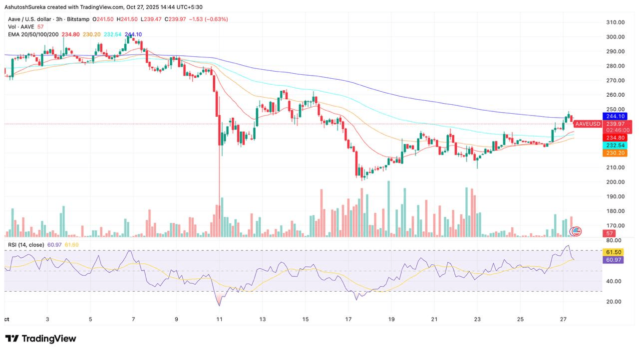 قیمت AAVE در حال حاضر حدود ۲۴۰.۴۴ دلار است و در ۲۴ ساعت گذشته ۵.۶ درصد رشد کرده است. این رشد ادامه روند صعودی از کفهای اواسط اکتبر محسوب میشود. ارزش بازار آن ۳.۶۸ میلیارد دلار و حجم معاملات روزانه ۳۱۷ میلیون دلار است که نشاندهنده افزایش مشارکت خریداران است.