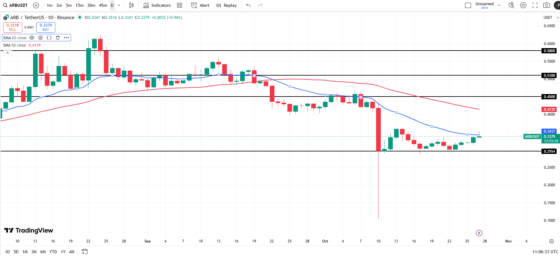 در نمودار روزانه قیمت آربیتروم، این ارز دیجیتال پس از سقوط تا حمایت ۰.۲۹۵ دلار، در حال بازیابی تدریجی است. اکنون هم نزدیک مقاومت میانگین متحرک ۲۰ روزه (۰.۳۴ دلار) در نوسان است. عبور و تثبیت بالای این سطح میتواند نشانهای از ادامه حرکت اصلاحی تا محدوده ۰.۴۵ دلار باشد.