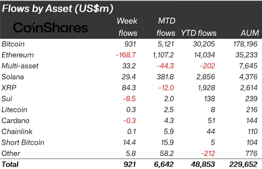 در این میان، بیتکوین با جذب ۹۳۱ میلیون دلار بیشترین سهم را داشت و مجموع ورودیها به محصولات مرتبط با آن از زمان شروع سیگنالهای کاهش نرخ بهره به ۹.۴ میلیارد دلار رسید. اتریوم برای اولین بار در پنج هفته گذشته ۱۶۹ میلیون دلاری خروج داشت، اما تقاضا برای محصولات با اهرم دو برابری اتریوم همچنان بالا است. جریان سرمایه به محصولات سولانا و ریپل نیز اگرچه کندتر شده، اما همچنان ادامه دارد؛ زیرا سرمایهگذاران در انتظار تایید احتمالی ETFهای جدید در آمریکا هستند.