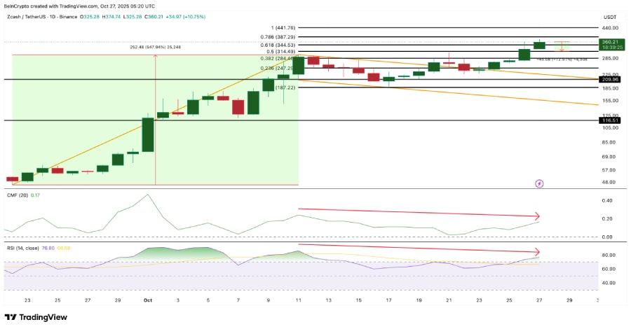 ۳. زیکش (ZEC): زیکش طی یک ماه گذشته بیش از ۵۴۰ درصد رشد کرده و از الگوی پرچم عبور کرده است. مقاومتهای ۳۱۴ و ۳۴۴ دلار شکسته شده و قیمت اکنون در مسیر حرکت به سمت هدف ۴۴۱ دلار قرار دارد. با این حال، واگرایی شاخص RSI و شاخص CMF نشان میدهد که ممکن است یک اصلاح ۱۰ تا ۱۲ درصدی رخ دهد و قیمت به سطوح ۳۱۴ یا ۲۸۴ دلار بازگردد. حمایتهای بعدی در ۲۴۷ دلار و ۱۸۷ دلار قرار دارند.