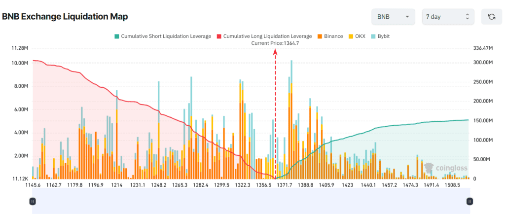 در صورتی که BNB در این هفته تا سطح ۱٬۱۵۰ دلار اصلاح شود، ممکن است بیش از ۳۰۰ میلیون دلار از موقعیتهای خرید لیکویید شوند. از سوی دیگر، اگر قیمت بایننس کوین از ۱٬۵۰۰ دلار فراتر رود و رکورد جدیدی ثبت کند، حدود ۱۵۰ میلیون دلار از معاملات فروش از بین خواهند رفت.