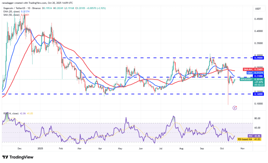 میانگین متحرک نمایی ۲۰ روزه (موج آبی، ۰.۲۱ دلار) و شاخص RSI که در محدوده منفی قرار دارد به نفع فروشندگان است. اگر قیمت از سطح میانگین متحرک نمایی ۲۰ روزه کاهش یابد، فروشندگان سعی خواهند کرد تا ارز DOGE را به کف محدوده یعنی ۰.۱۴ دلار برسانند.
