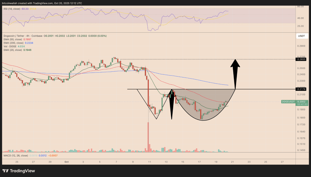 دوج کوین در حال شکل دادن الگویی صعودی به نام «آدم و حوا» (Adam and Eve) است. در این الگو، ابتدا یک افت تند و تیز به شکل حرف V رخ میدهد و سپس بازیابی نرمتر و گردتری شکل میگیرد. این الگو معمولاً نشانه کاهش فشار فروش و بازگشت کنترل بازار به دست خریداران است.