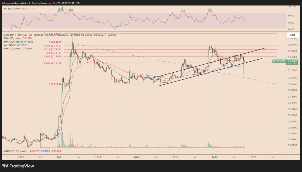 خط گردن (neckline) این الگو در نزدیکی ۰.۲۱۶ دلار قرار دارد و در صورت شکست قطعی این مقاومت، انتظار میرود قیمت دوج کوین تا محدوده ۰.۲۶ دلار افزایش یابد؛ یعنی حدود ۲۵ درصد بالاتر از قیمت فعلی. این هدف قیمتی با محاسبه اندازه حرکت الگو (measured move) مطابقت دارد و با یک ناحیه تکنیکالی مهم نیز همپوشانی دارد. همچنین، این سطح با نسبت اصلاح فیبوناچی ۰.۳۸۲ در نمودار هفتگی دوج کوین منطبق است.
